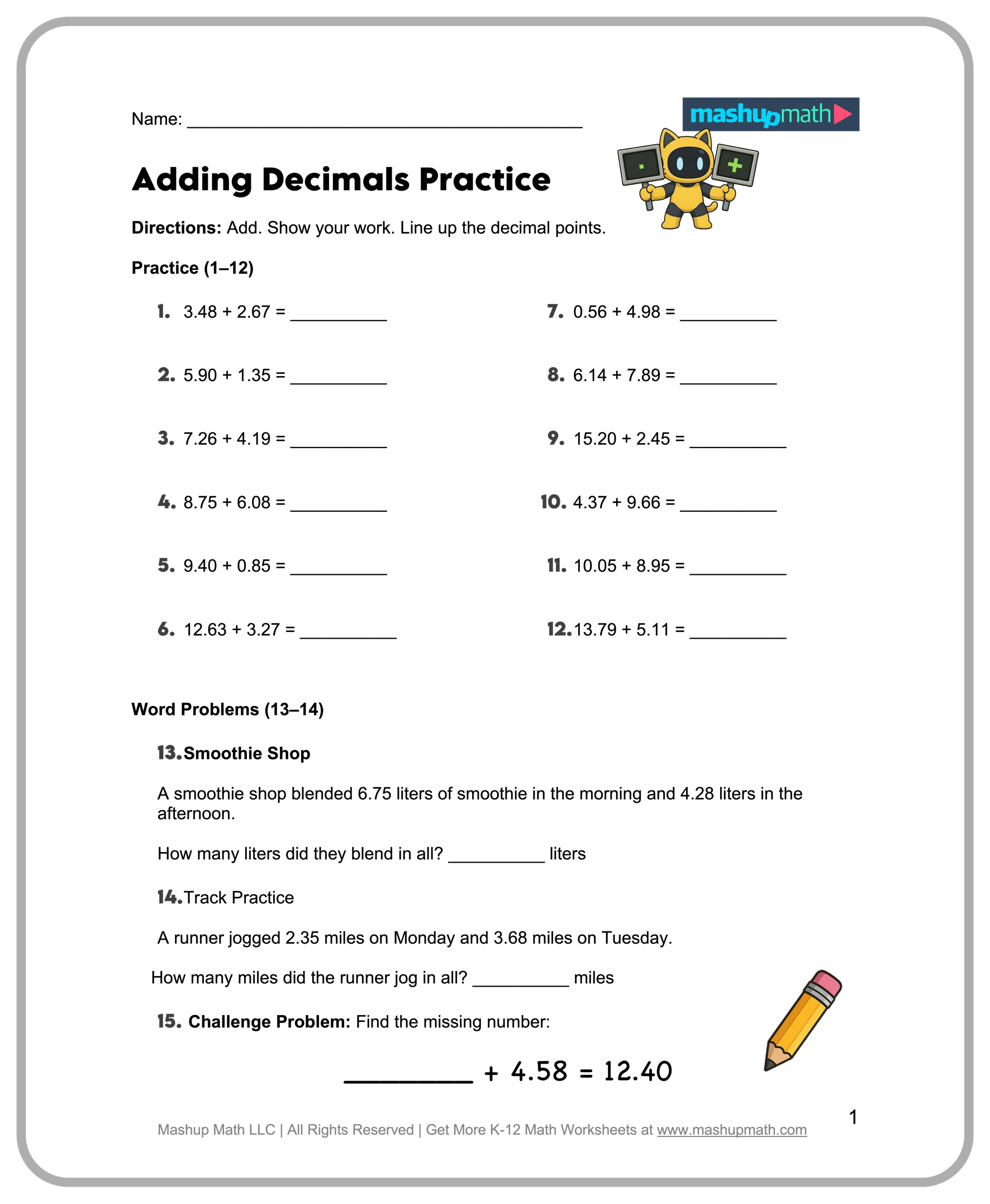 ▶️ Add/Subtract Decimals Word Problems (A)
