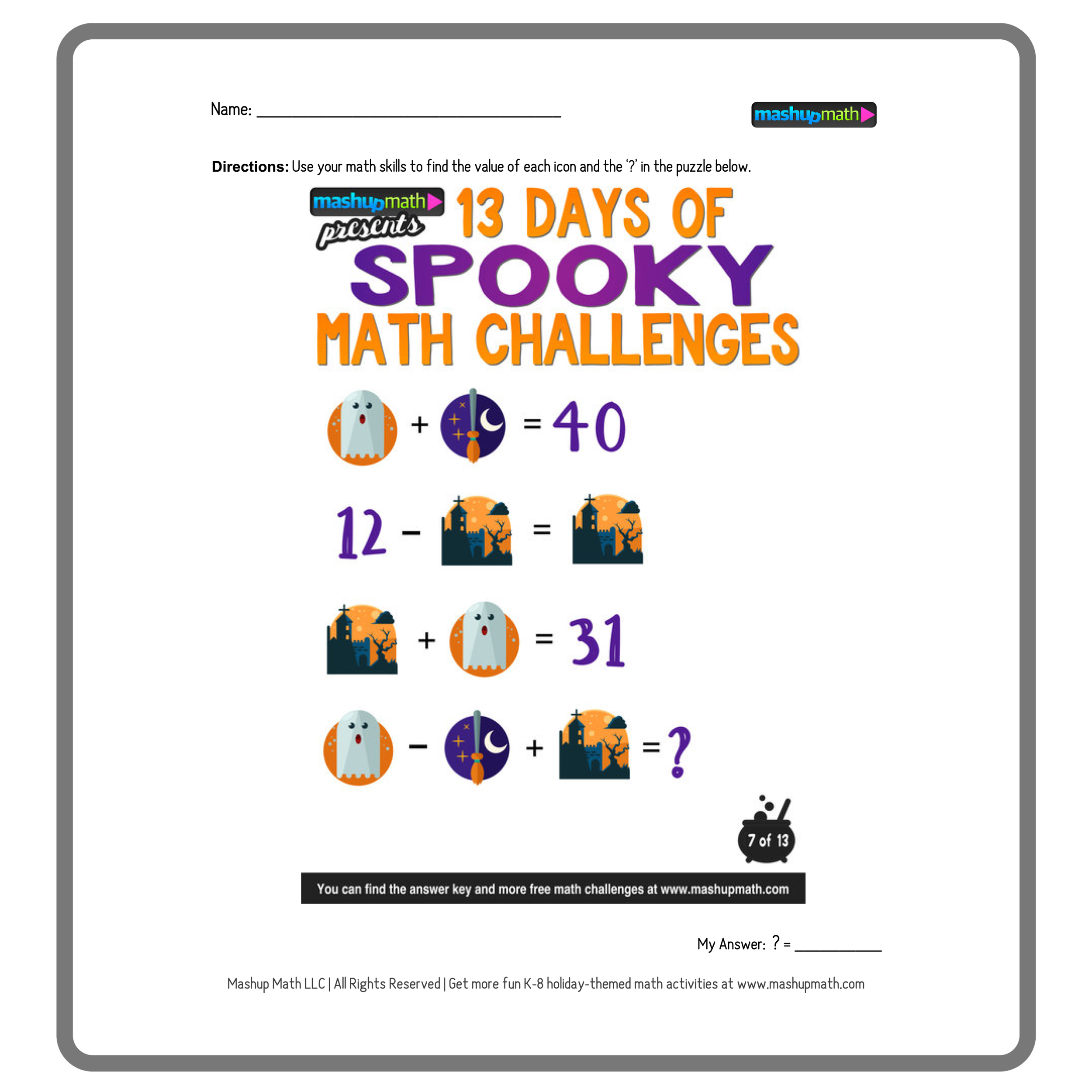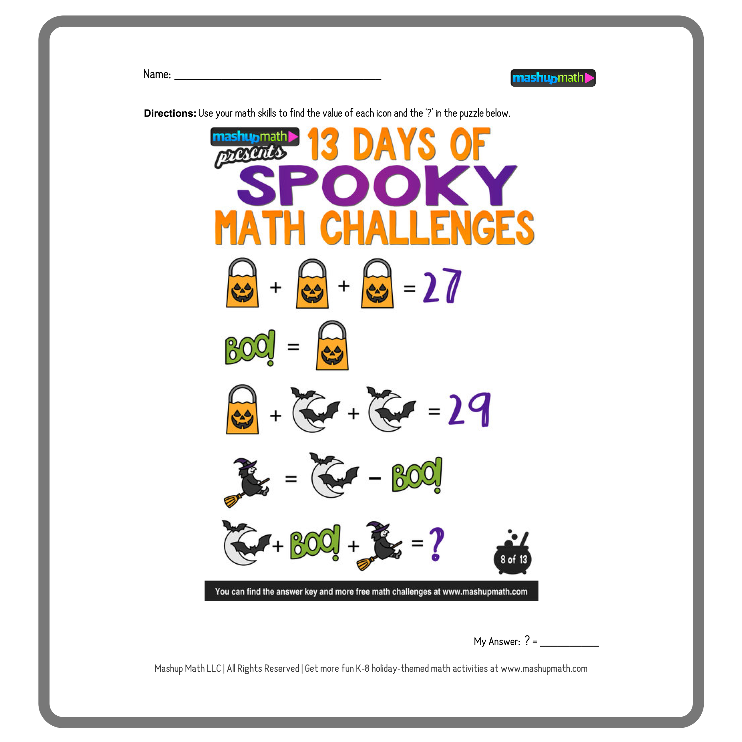 Halloween is an exciting time for your students, and you would be ghoulish not to channel their enthusiasm into engaging math learning experiences. So, go ahead and share our 13 Days of Spooky Math Puzzles for Grades K-8 in your upcoming lessons and let the fun begin! Integrate these puzzles as a daily warm-up or a fun end-of-day activity to keep the spooky spirit alive. (Just don’t eat too much candy, or you’ll get a mummy ache!)
