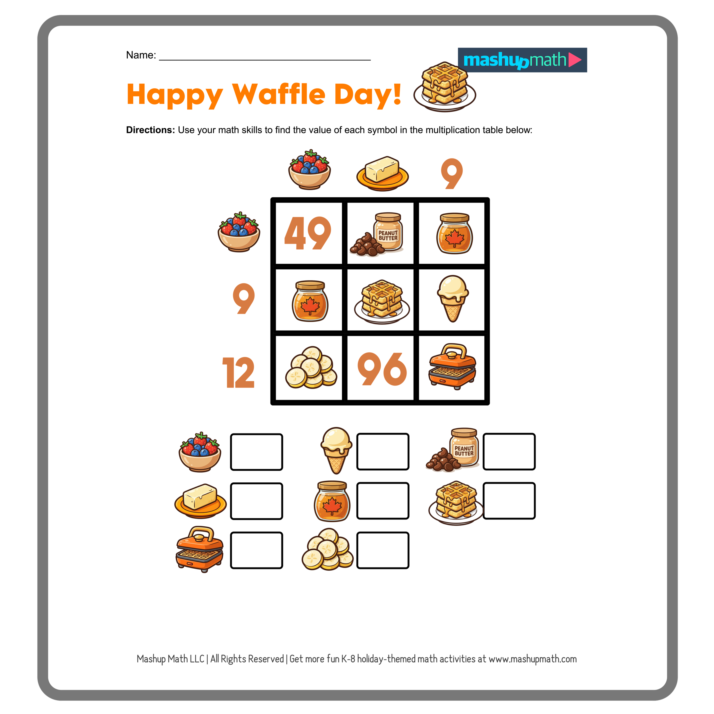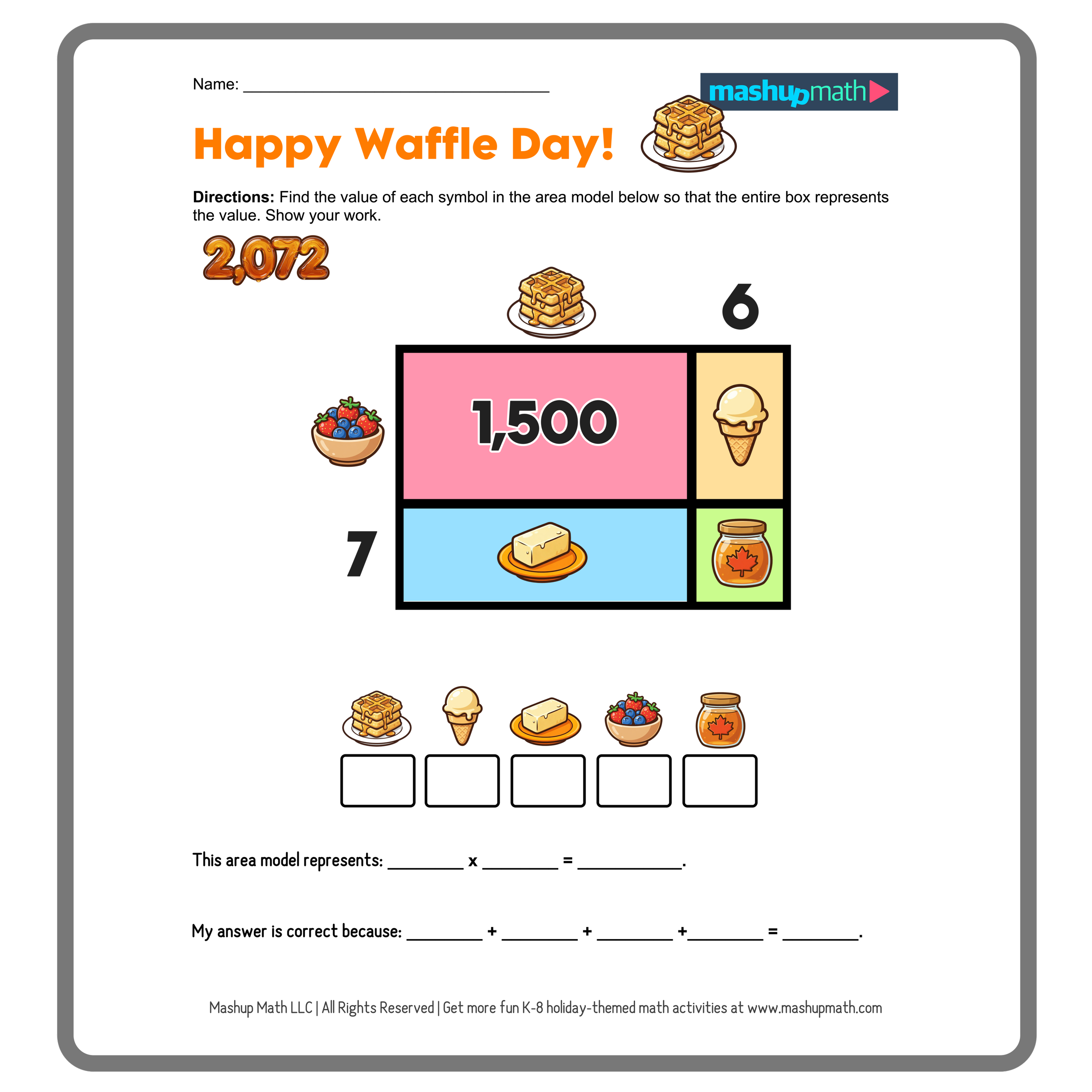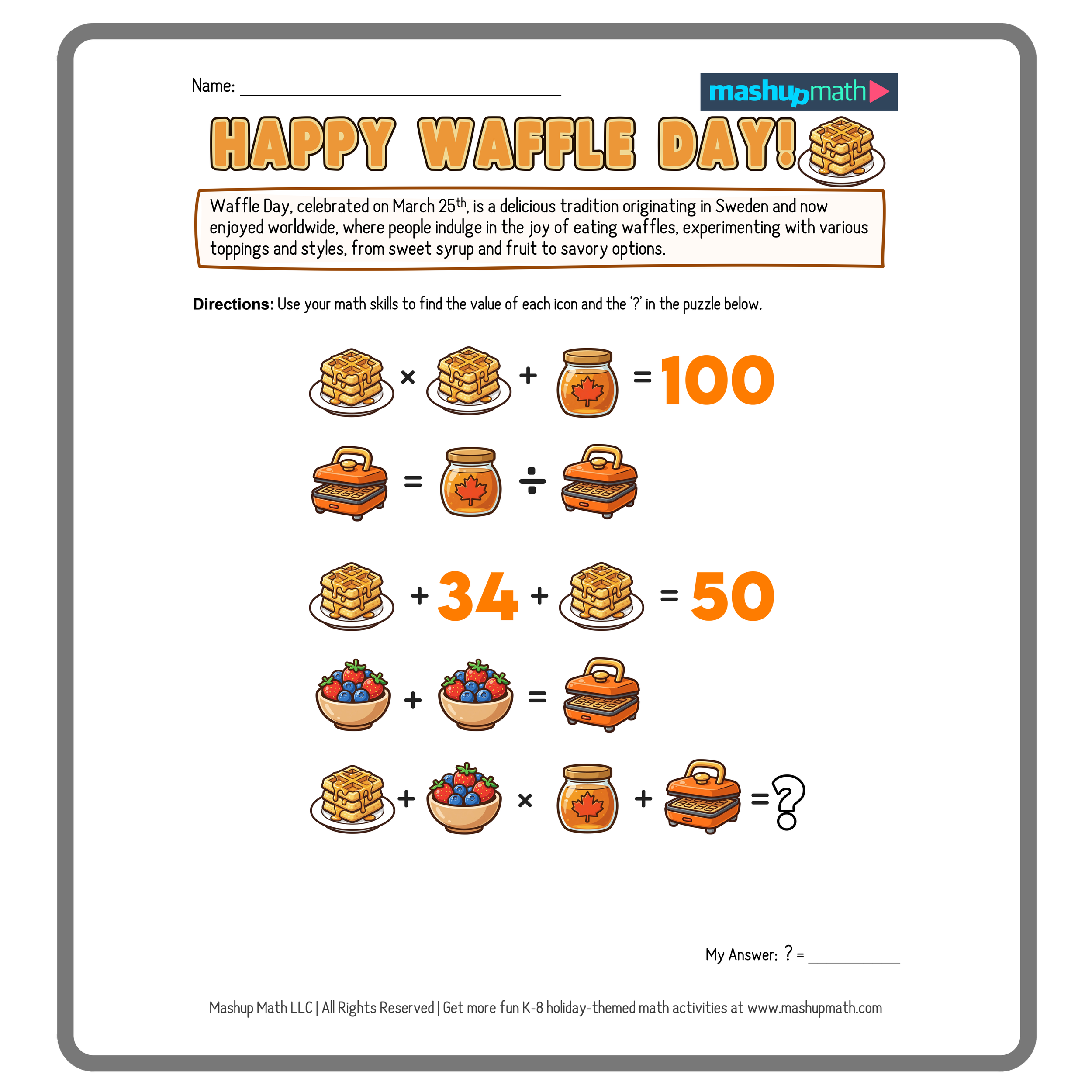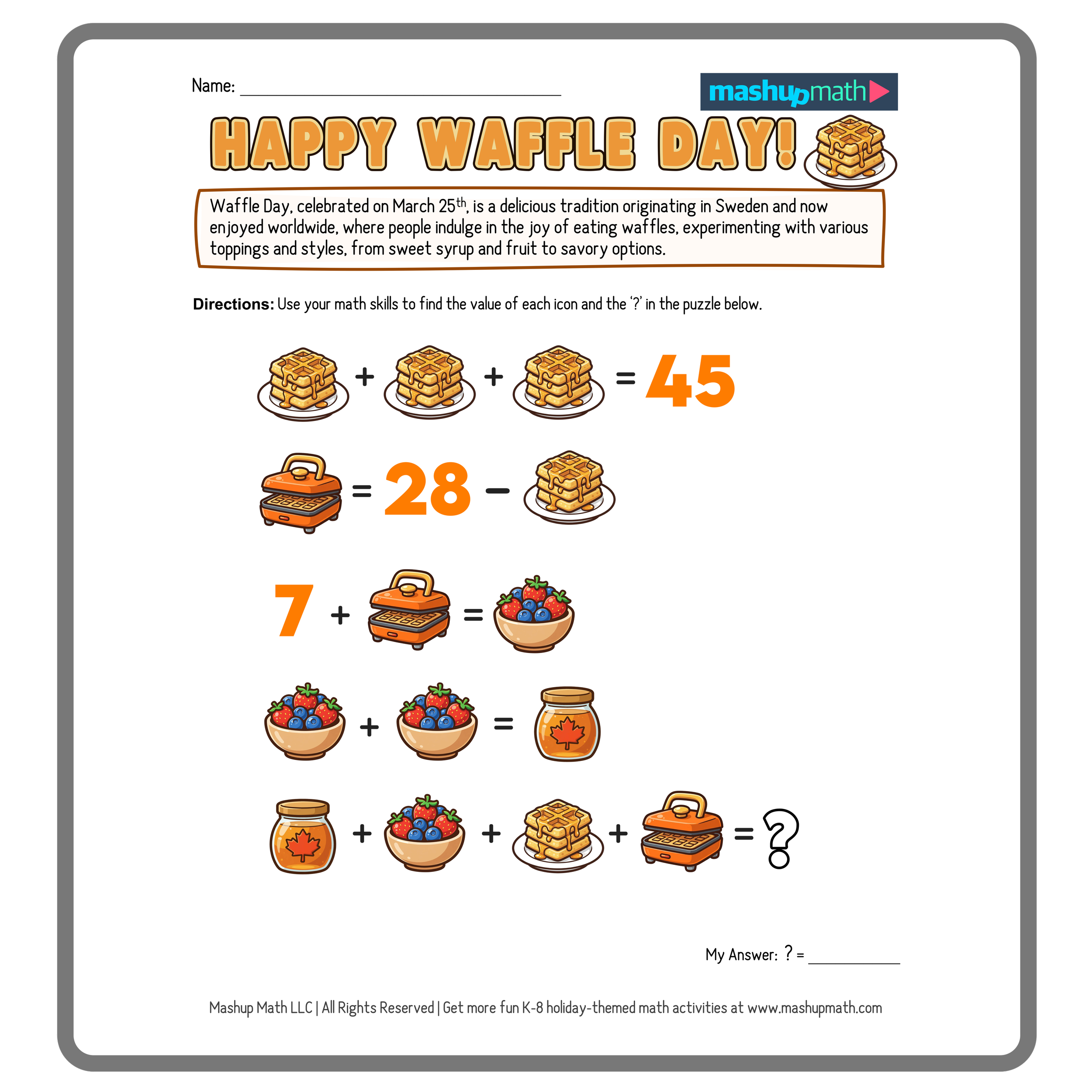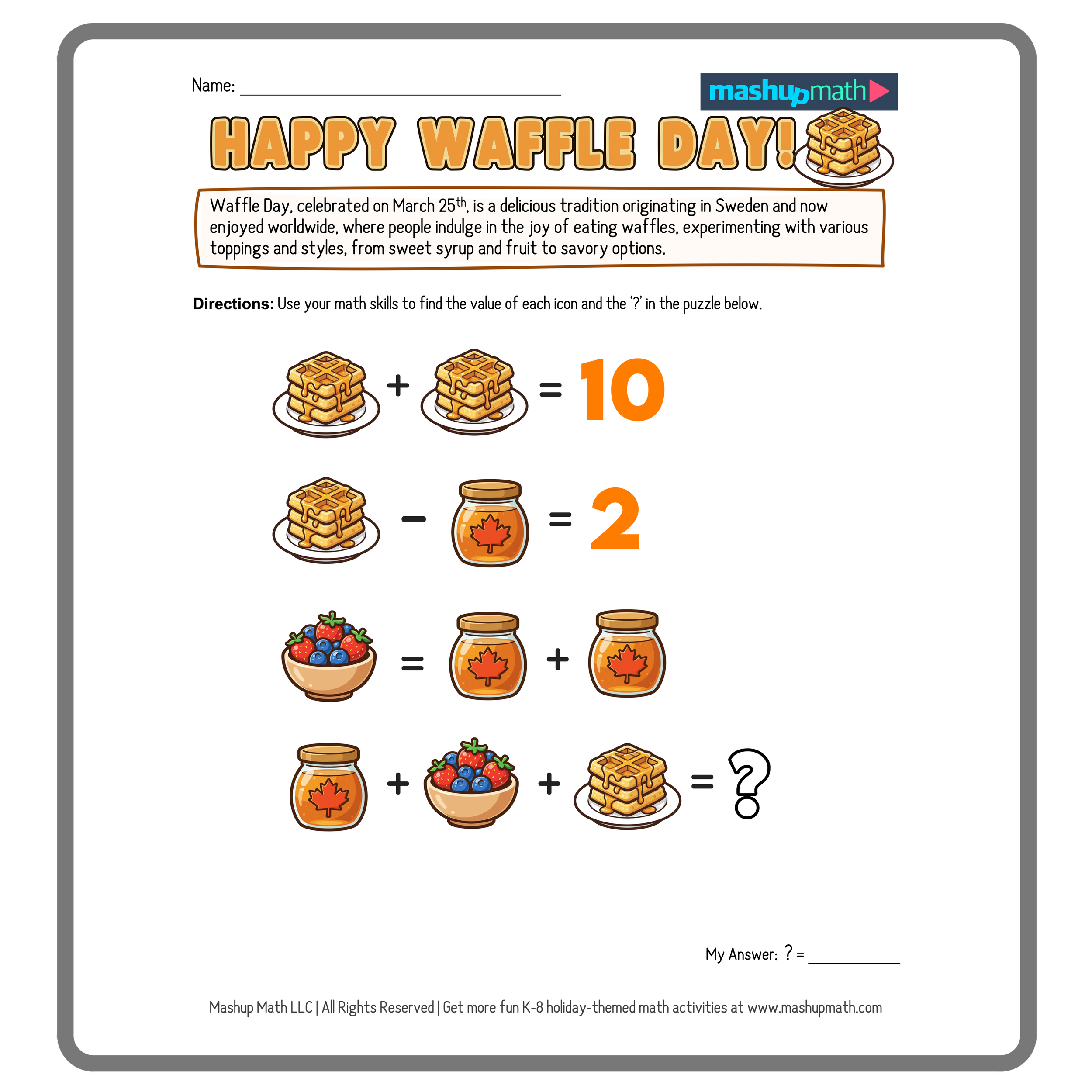 March 25th is an extra special day for breakfast lovers: it’s International Waffle Day! This fun holiday celebrates the Waffle, which was invented in Sweden in the 1600s. The doughy treat then continued to evolve until 1839, when the thicker and fluffier Belgian Waffle was created. You can celebrate at home by eating a stack of waffles—and you can celebrate in your classroom by working on some fun Waffle-themed math activities!